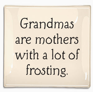 Grandmas are mothers with a lot of frosting—a truth that deserves a home on your table. This handcrafted bent-glass tray, made in our New York studio using the French découpage tradition, layers vintage-style typography beneath glass in soft cream tones. Each piece is individually signed by Ben and finished with a felted back for stability. Food-safe and wipe-clean, it works beautifully on a vanity, coffee table, countertop, or hung with a plate hanger. A folded card shares the story of its meticulous craft. The perfect gift for the grandmother who does it all—equal parts wit, warmth, and well-deserved sweetness.